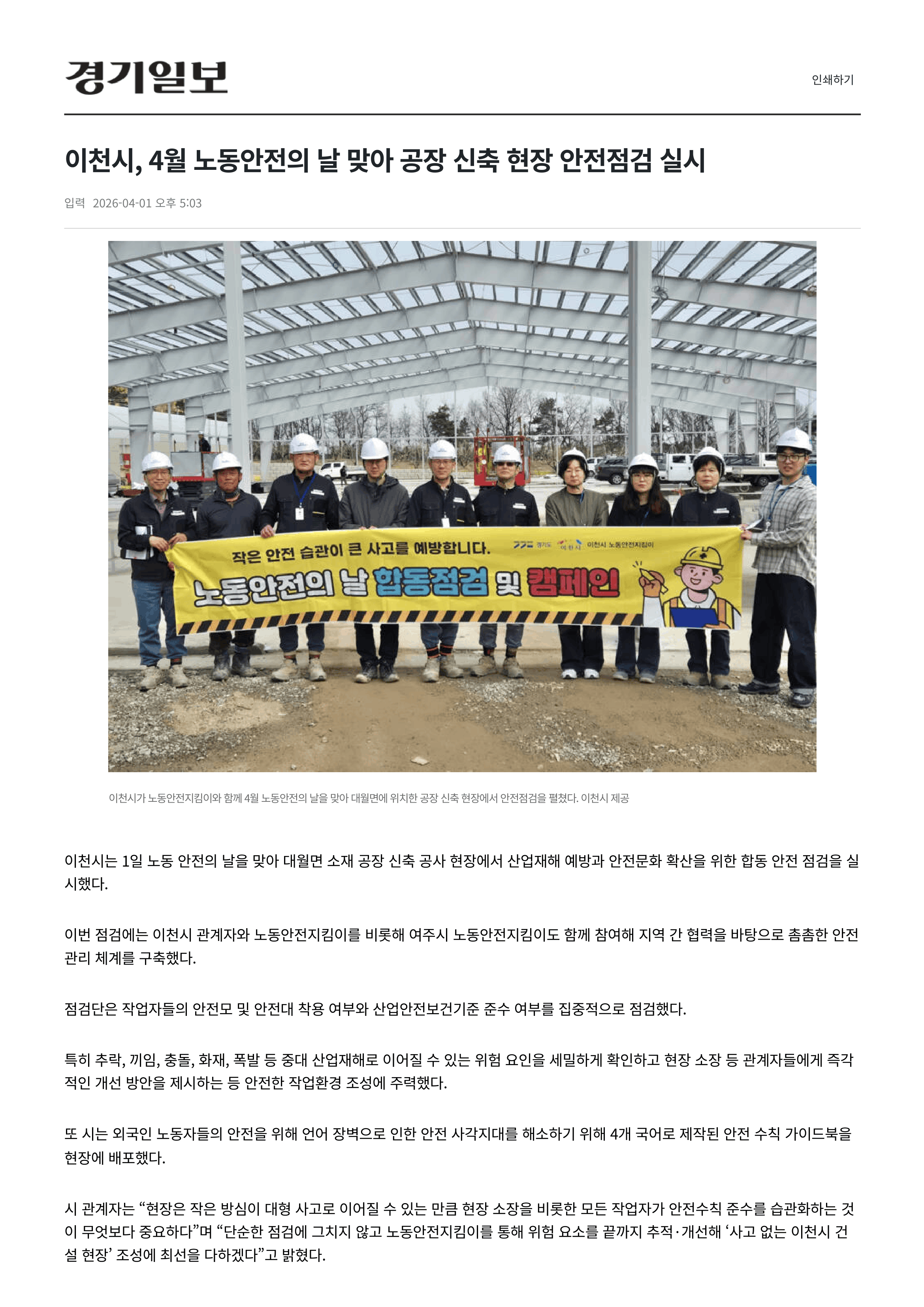 이천시, 4월 노동안전의 날 맞아 공장 신축 현장 안전점검 실시